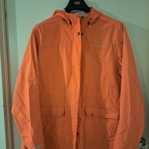 Lohenpunainen korallin värinen takki syksyyn. Kaksisuuntainen vetoketju, säätönyörit vyötäröllä ja helmassa, taskuja, huppu.