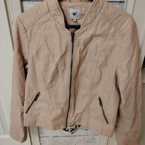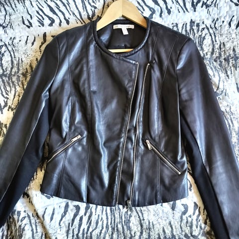 H&M:n konjakinvärinen (?) tekonahkatakki, lyhyehkö malli. Kunto kuin uusi. Nappikiinnitys, edessä napilliset taskut ja rinnassa pieni vetskaritasku. Koiratalous.