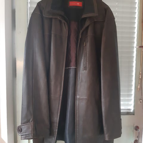 Hyväkuntoinen ruskea nahkatakki. Ysärityylinen rento leikkaus, jota saa muokattua vähän kiristysvöillä takin alareunasta. Sisäpuolelle kolme povitaskua joista kaksi isoa, toisessa isossa vetoketju ja toisessa nappi.