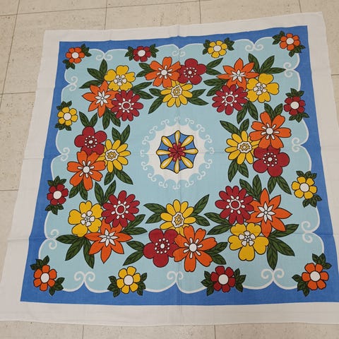Upea kukkakuosinen pöytäliina kaiketi 1960-luvulta, voi olla vanhempikin. Ehjä, siisti ja tahraton. Koko noin 84cm x 84cm.