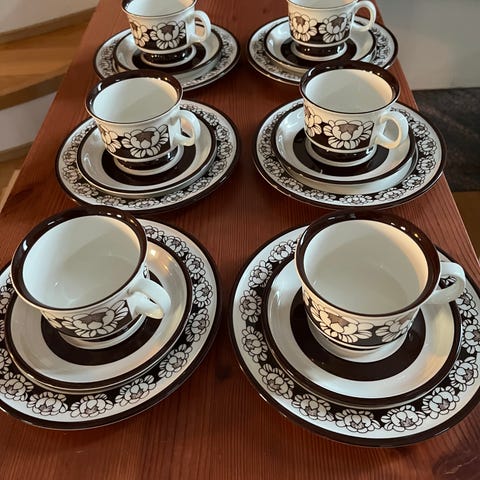 Katrilli -sarjan kahvikuppisetit, sokerikko ja kermakko sekä tarjoilulautanen