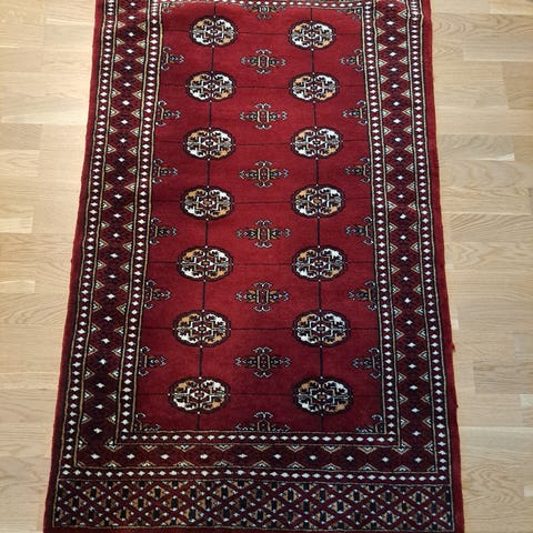 Aito turkmenialainen käsinkudottu iranilainen matto, vintage, mitat 155 × 123 cm, orgaaniset värit, luonnolliset silkkiupotukset, yli 80 vuotta vanha, erittäin pehmeä ja erittäin hienorakenteinen kudonta (n. 90 riviä), antiikki ja erinomaisessa kunnossa, taitettavissa kuin kangas ja helposti kannettavissa repussa tai pienessä käsilaukussa, sopii sekä moderniin että perinteiseen sisustukseen.