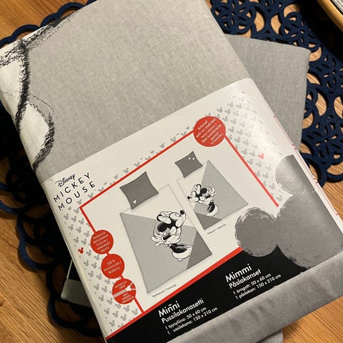 Pussilakanoita on tosiaankin tuo Mikki toisella puolella. Toiselta puolelta koko valkoinen. Näissä on nepparikiinnitys.