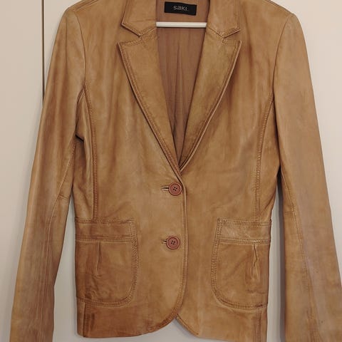 Puhdas, vähän käytetty SAKI-merkkinen naisen lyhyt nahkatakki. Aitoa nahkaa. Kaunis vaalea, viileä beigen väri. Vetoketjukiinnitys. Koko 38