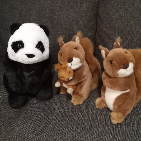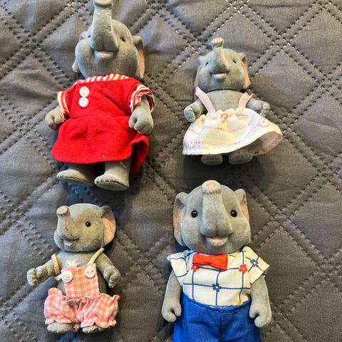 Forest families vintage pandaperhe 80-luvulta. Vaatteet eivät näitten alkuperäiset. Kulumaa on, etenkin korvisra väri lähtenyt. Nukkapinta kuitenkin muutoin kunnossa.