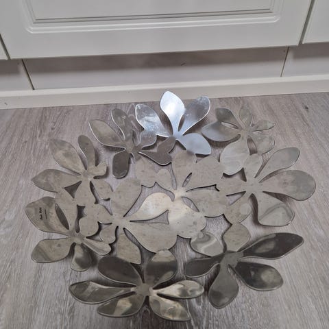 Ruostumatonta terästä, kunto uudenveroinen. Kaunis myös sellaisenaan koristeena.