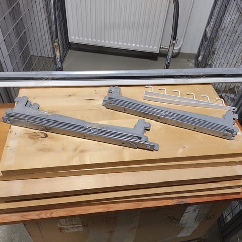 Kaksi paria hyllykiskoja sekä 12 pitkää ja 21 lyhyttä kannatettavia. Lisäksi 14 kulmarautaa 4 muuta kiinnikettä isompia hyllyjä varten.