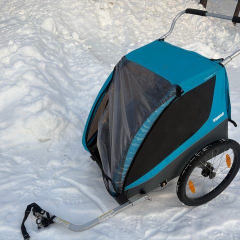 Yhden tai kahden lapsen kuskaukseen soveltuva pyöräkärry.