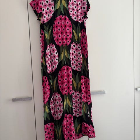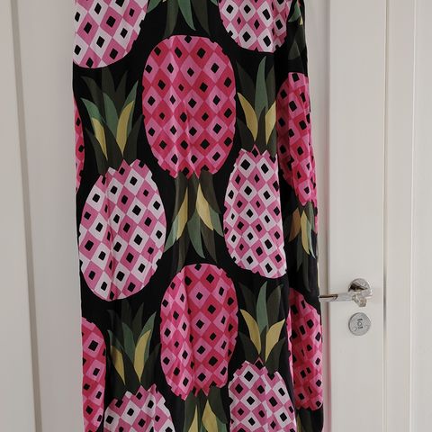 Marimekon Pekaani Long Acapulco mekko, ananas kuvioita. Maksimittainen, sovituskuvassa 167 cm pituisen ja 40/42 kokoisen päällä. Koko 38 / M, reilu mitoitus. Siisti, vähän käytetty kunto, kirkkaat värit, ei erityistä moitittavaa.