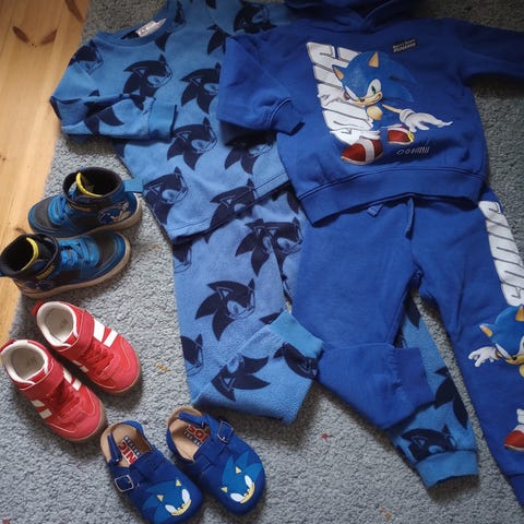 Nike lasten trikoopaita, H&M raidallinen trikoopaita ja Me & i tummansiniset housut (näissä pieni reikä taskun yläreunassa)koko 98/104. Kuvissa näkyy pitkähihaiset paidat ja housut, jotka soveltuvat arkipukeutumiseen ja vapaa-ajan käyttöön.