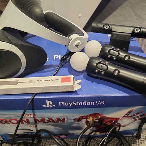 Sony PlayStation VR virtuaalitodellisuussetti sisältää VR-laitteen, ohjaimet ja tarvittavat kaapelit. Setti on yhteensopiva PlayStation-pelikonsolien kanssa ja tarjoaa immersiivisen pelikokemuksen virtuaalitodellisuudessa.