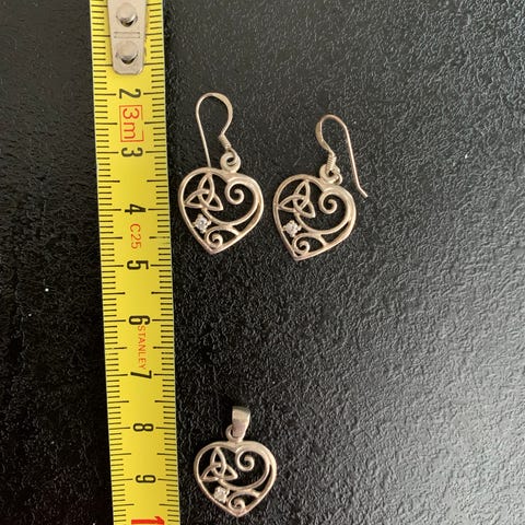 Ketjun n. 45 cm, riipus n. 3,1 cm, korvakorut n. 3 cm koukkuineen. Aiheena onnensolmu. Mukaan rasia. Hinta koko setille.