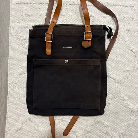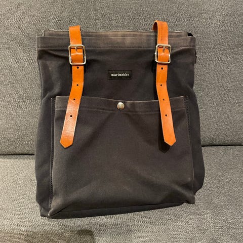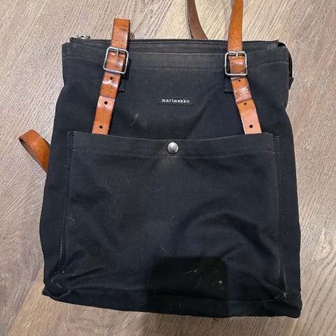 Marimekon Eppu reppu, alakulmissa kulumaa, mutta ei puhki saakka. Edelleen siistin mustan värinen kangas.