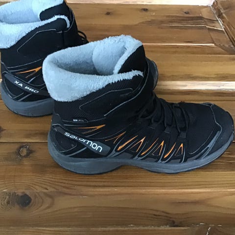 Musta/harmaa Salomon xa pro goretex lenkkarit koossa 37. Mielestäni pientä kokoa.