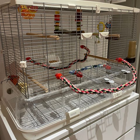 Orsi, jossa kynsien hiomista varten oleva pinta, juomapullo, iso juomapullo, sekalaisia pidikkeitä jotta juomapulloja saa kiinni häkkiin.