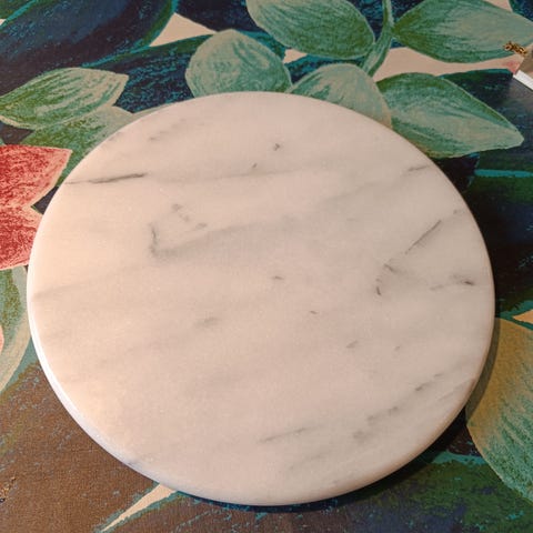 Myydään marmorinen tarjoilulautanen. Iästä ei tarkkaa tietoa, mahdollisesti 80-luvulta. Yksi muovista jalaksista kadonnut.
