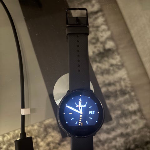 Myydään toimiva urheilukello. Väri kupari-musta. Kellossa nyt kiinni mukava joustava beigevärinen tarrasäätöranneke. Mukaan myös laturi.