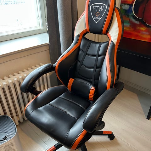 Oikein mukava, ja helposti säädeltävä pelituoli jollekkin onnelliselle. Pieni jälki selkänojassa, mutta pesulla pitäisi lähtä. Tarjoa vain rohkeasti.