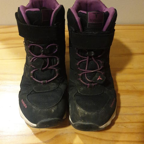 Koon 37 Treksta Goretex-varsikengät. Poika käytti näytä talvellakin, mutta mielestäni nämä lienevät paremmat kuitenkin välikausikengiksi. Mutta jos ei ole kovia pakkasia niin varmasti näillä pärjää silloinkin. Kärjissä on hieman kulumaa, mutta kyllä näistä on vielä ulkoilukengiksi. Näissä ei ole perinteisiä nauhoja vaan kengissä on turvakengistäkin tuttu pikakiinnitys. Ruuvista kierretään kenkiä kireämmälle ja siitä painamalla ne löystyy.