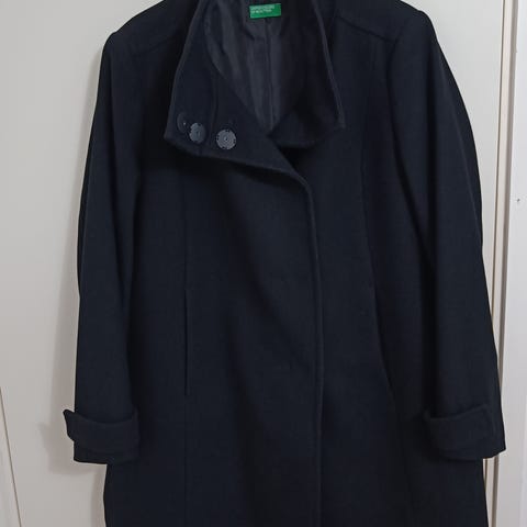 Myydään erittäin kaunis Benettonin villakangastakki koko 46. Todella laadukas takki, kaunis malli. Musta, takissa vuori.