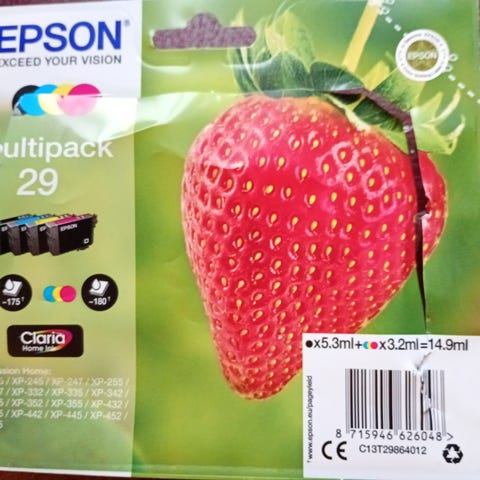 Myynnissä avaamaton Epson 29 “hedelmä-sarjan” multipack, joka sisältää kaikki tarvittavat värit yhdellä iskulla: musta, syaani, magenta ja keltainen 🍒🍋🍇🫐