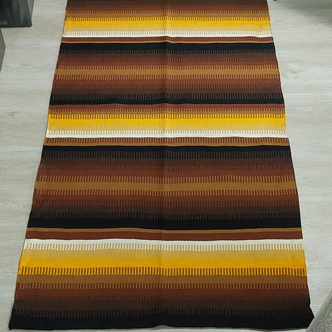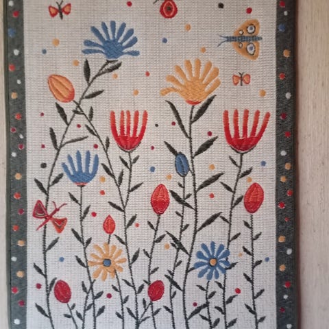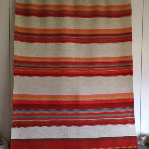 Siisti punasävyinen raanu / seinävaate / seinätekstiili. Kiinnitystä varten metallinen tanko yläreunassa.