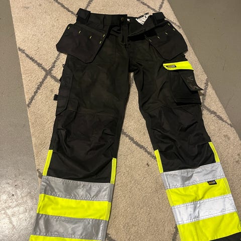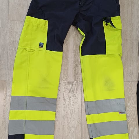 Uudet huomioväri työhousut. Housuissa on kuusi taskua ja paikka esim vasaralle. Housuissa ei lue kokoa mutta ne on arviolta kokoa 160cm.