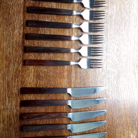 Huippukuntoiset pronssiaterimet/ Fiskarsin ruostumaton, laatikossa.