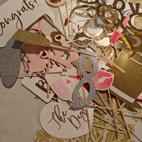 Myydään polttarisetti, johon kuuluu kuvausrekvisiittaa, 4kpl pinkit sydänlasit ja bride to be -nauha. Kuvausrekvisiitat täytyy erikseen liimata vielä yhteen. Bride to be -nauha ollut kerran käytössä.
