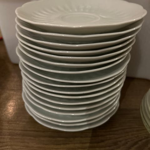 Lautasten ja kastikekaadin sarja, sinivalkoinen kuviointi. Sarja sisältää useita lautasia ja kastikekaadin, valmistettu posliinista. Soveltuu kattaukseen ja tarjoiluun.