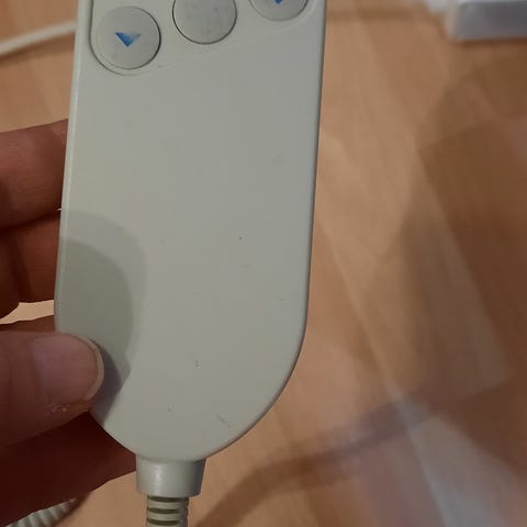 Pyörillä oleva, sähkökäyttöinen toimiva sänky. Patja siisti paksulla muovipäällysteellä.