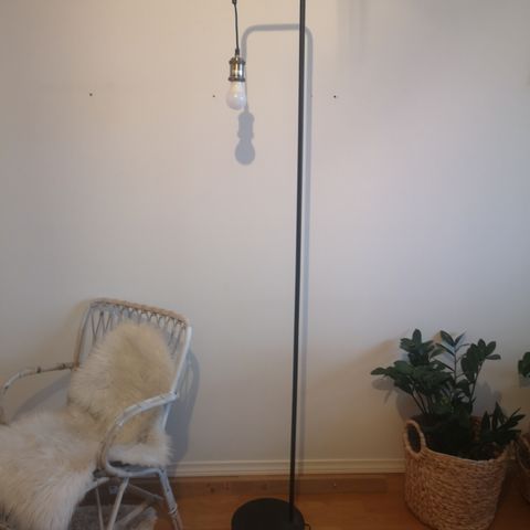 Musta rottinkikupuinen valaisin, jossa jalka-osa teräksenvärinen. Kuvun alla erillinen valokatkaisin