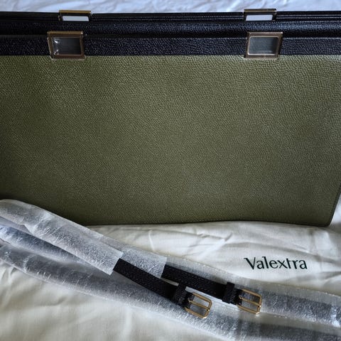Ylellinen Loro Piana inside out tote laukku. Laukku on luonnonvalkoista hammered nahkaa, jossa on tumman siniset olkahihnat. Sisävuori on kuuluisaa Loro Pianan cashmere villaa. Laukkua voi käyttää kummalta puolelta tahansa, nahkaisena tai cashmere puolelta. Laukkuun kuuluu punainen irroitettava nahka clutch laukku. Laukku on tilava ja sopii matkusteluun, läppäri mahtuu sisälle. Käyttämätön laukku.