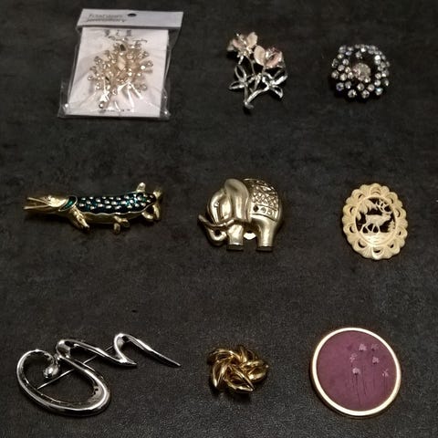 Kolme pientä hienoa hedelmäistä rintakorua/pinssiä, kirsikka, sitruuna ja päärynä.