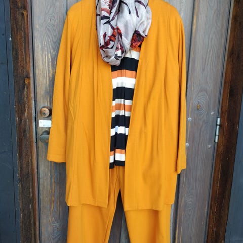 Pukuun kuuluu pitkähihainen mekko osa ja pitkät housut samaa materiaalia