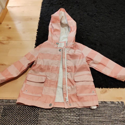 Lasten sadetakki ja housut, koko 98, väriltään kirjava. Takissa on tähtikuvioita ja vaaleanpunaisia yksityiskohtia. Housut ovat violettia väriä, sopivat tytöille.