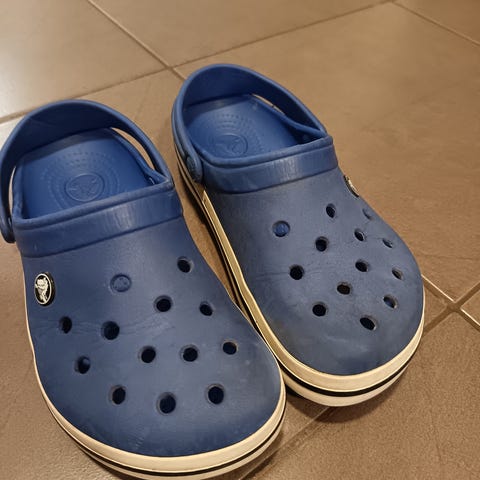Crocs sandaalit, kokoa 36-37 US M4 W6, vihreä-harmaa väriltään. Jotain esteettistä puntatummumaa, mutta ehjät ja käyttöikää vielä hyvin jäljellä. Sopivat käytettäväksi sekä sisällä että ulkona. Meillä nämä olivat enimmäkseen sisäkenkinä koululla.