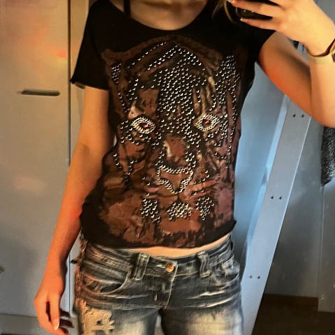 Naisten t-paita, kaunis kirjailu, jossa kimmallusta, jäänyt käyttämättömäksi, koko vastaa noin S- M. Hinta 3€