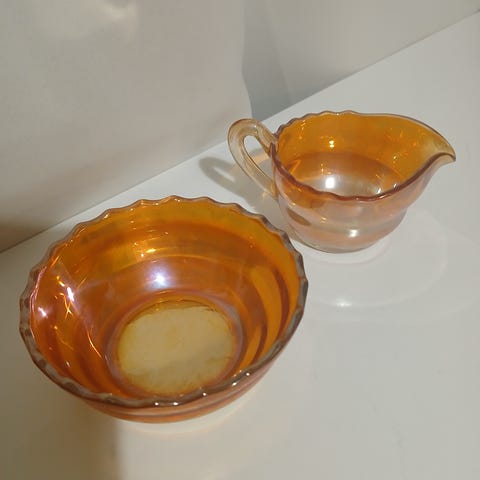Kirkaslasiset vanhat astiat: kermakko ja sokerikko, erinomaisessa kunnossa.