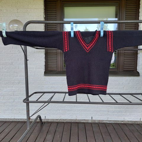 Hienosti värinsä säilyttänyt vintage neulospaitapusero. Muotolaskokset rintojen kohdalla edessä ja takana vyötäröllä. Hihat lyhennetty itse vajaamittaisiksi, muuten mielestäni tehdastekoinen vaate. Olisiko 60-luvulta. Kainalosta kainaloon mitta venyttämättä reilu 45 cm ja olka-helma pisimmillään noin 65 cm, kaareva helmaosa. Joustaa hyvin, mutta olisikohan koko 38 suurinpiirtein oikea. Sopii mielestäni kokoja 36-reilu 40 käyttävälle.