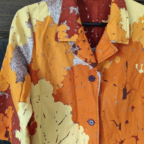 Kainalosta kainaloon mitta noin 50 cm, olka-helma reilu metri ja vyötärön leveys summittaisesta kohdasta mitattuna noin 53 cm. Kangas ei ole joustava, ja väri hiukan kuvia pehmeämpi/haaleampi. Viimeiseen kuvaan yritin hiukan likaa kuvata, selkeästi ei pesun jäljiltä laitettu säilytykseen, joten kuvittelen pois lähtevän. Enemmän tuntui käteen, kuin näkyy tuosta kuosista. Vuosikymmeniä kuivalla vintillä pakattuna säilytetty. Savuton ja lemmikitön koti, MMM.
