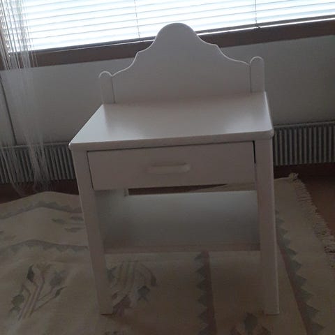 Yö-pöytä 2 laatikolla, kuvanmukainen, mäntyviilutettu kansi, massiiviset mänty-jalat.