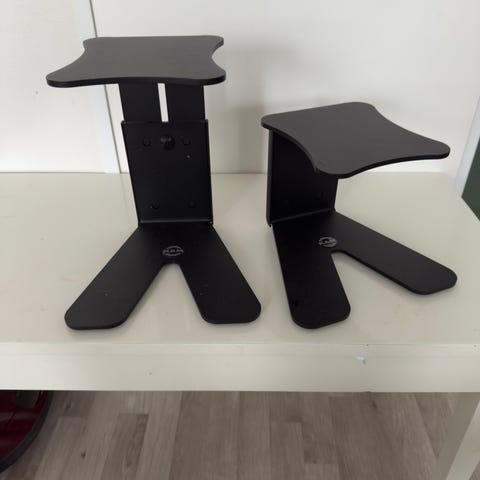 Metalliset monitorijalustat. Kosmeettista kulumaa. Studiomonitoreille tai muuhun hifi-hommaan. Korkeus 69,5cm. Mieluiten nouto.
