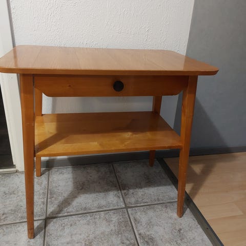 Kuvien mukainen pikkupöytä. Tasossa erilaisia jälkiä,katso kuvat. Saattaisi saada kevyellä hionnalla kuntoon tai käyttää ihan noin tuonkuntoisena.