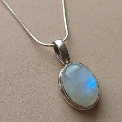 Hopeinen kaulakoru Suvi, jossa kirkas kivi keskellä. Ketjun Pituus: 49 cm.