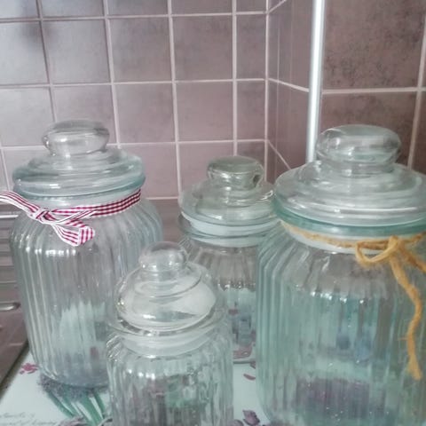 3 kpl lasipurkkeja, vihertävää lasia ja kannen materiaalina korkki. N. 20 cm. Korkeita, halk. 9 cm. Sopii esim. Kuivattujen sienien säilytykseen.