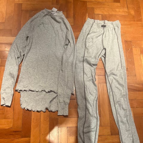 Kuvan setti Craftin uusia kerrastoja, koko naisten S: housut, tuulihousut, 5kpl puolipitkä housuja, 2kpl bokserit, 4kpl pitkähihaista paitaa, t-paita ja hihaton (XS). Hinta yhteensä 45€