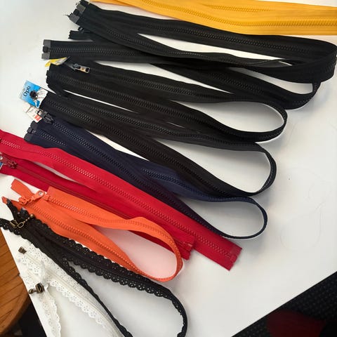 Käyttämättömät vetoketjut 34 kpl eripituisia ketjuja.