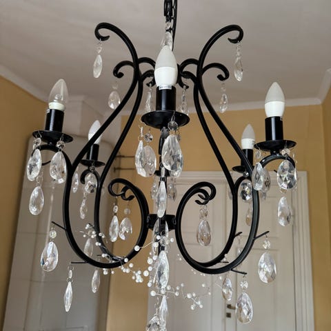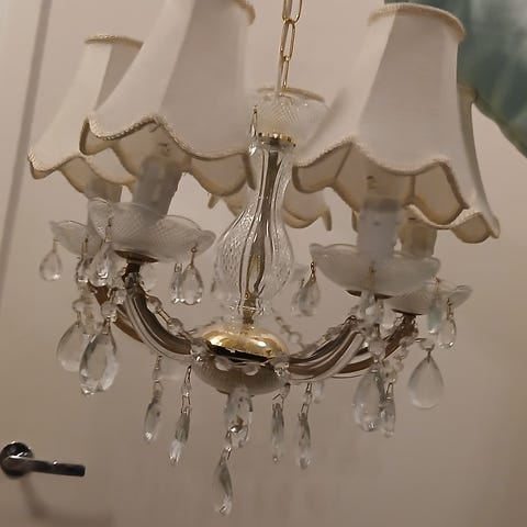 Myydään hyvässä kunnossa oleva kristallikruunu ja 2 kpl seinälamppuja. Kristallikruunun kristallit pesty ja laitettu laatikkoon säilytykseen. Mukaan saa 10kpl roosan sävyisiä lampunvarjostimia sekä 2kpl vaaleita varjostimia.