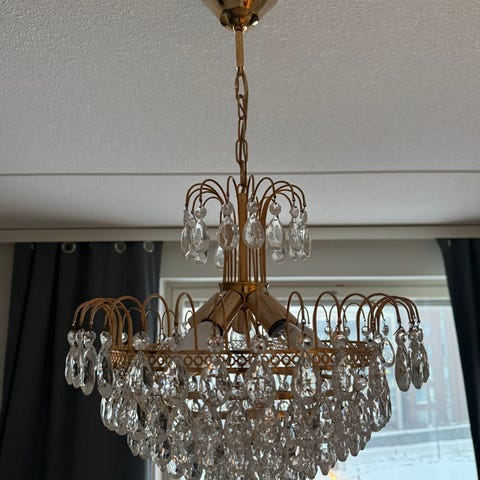 Kristallikruunu kattovalaisin, jossa on paljon kristallia. Valaisin tarjoaa koristeellisen valaistusratkaisun. Kaunis olohuoneessa, ruokailutilassa taikka makuuhuoneessa. Halkaisija 40 cm. Valaisimessa on kuusi lamppua. Nouto ja käteismaksu/MobilePay.
